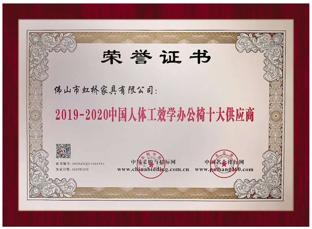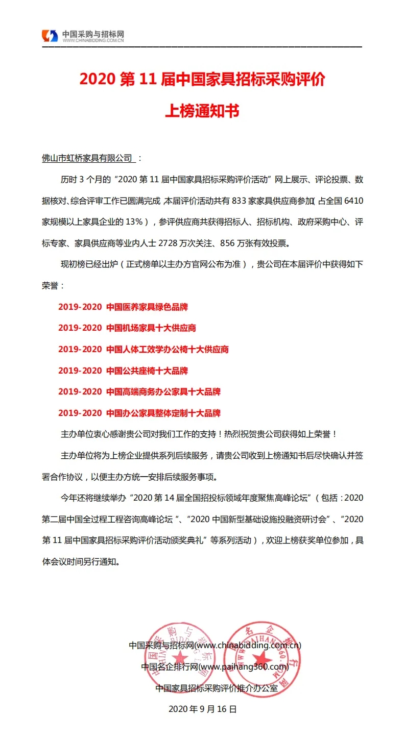 日前,在北京舉行的2020年第14屆全國招投標領域年度聚焦盛典頒獎晚會上,中國辦公家具招標采購評價推介活動頒獎環節備受矚目,虹橋家具憑借在市場上的出色表現,在“2020第11屆中國家具招標采購評價暨《招標投標法》實施20周年紀念活動”評選活動中榮獲第三名,同時榮獲“中國醫養家具綠色品牌”“中國機場家具十大供應商”“中國人體工效學辦公椅十大供應商”“中國公共座椅十大品牌”“中國高端商務辦公家具十大品牌”“中國辦公家具整體定制十大品牌”等多項榮譽。